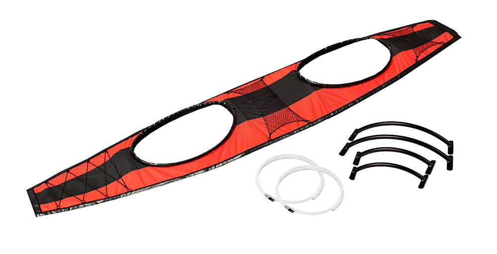 Removable covering deck for the boat SEAWAVE prevents from getting water into the boat. Additionally it offers a further easy accessible storage space which you can use during a shorter or longer travelling. The cockpit is to be attached on the inflated boat simply by means of velcro. The SEAWAVE cockpit is delivered together with four light metal reinforcements that help to hold the shape and increase the stiffness both of the cockpit and the boat itself. Furthermore the cockpit includes a plastic collar reinforcement on, which can be placed a standard spray skirt so the boat becomes completely watertight. Cockpit is delivered together with both types of reinforcements in a closable textile bag.